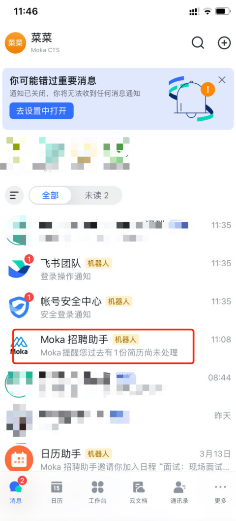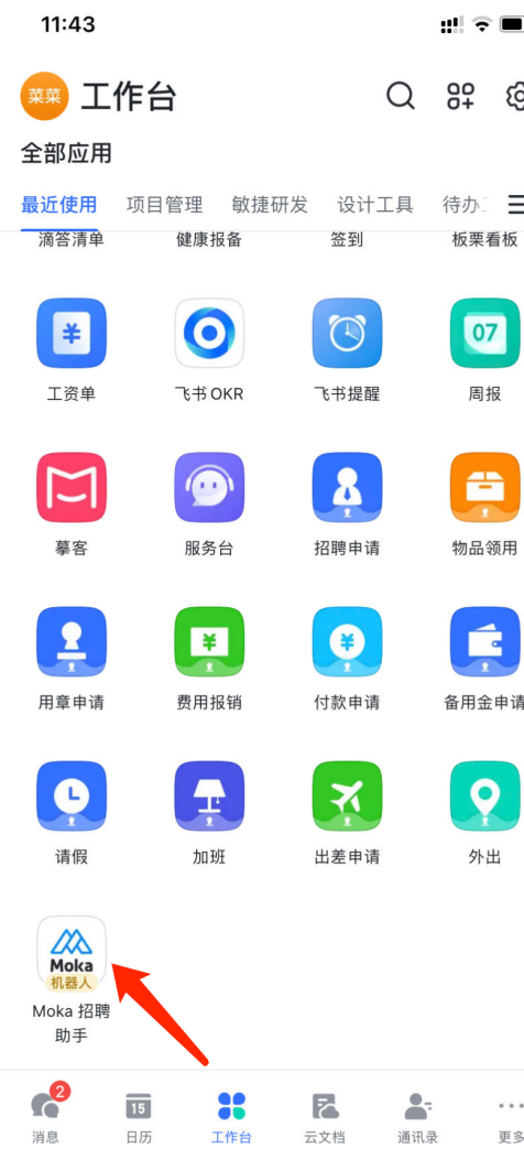 打开飞书APP在工作台找到“Moka招聘助手”(企业可自己配置名称可能有不同)点击图标可进入绑定帐号环节,可通过邮箱帐号和手机号两种方式进行绑定,绑定之后在列表页会消息,点击进入可以查看筛选,面试,审批等任务