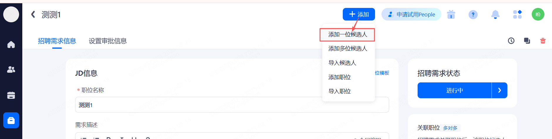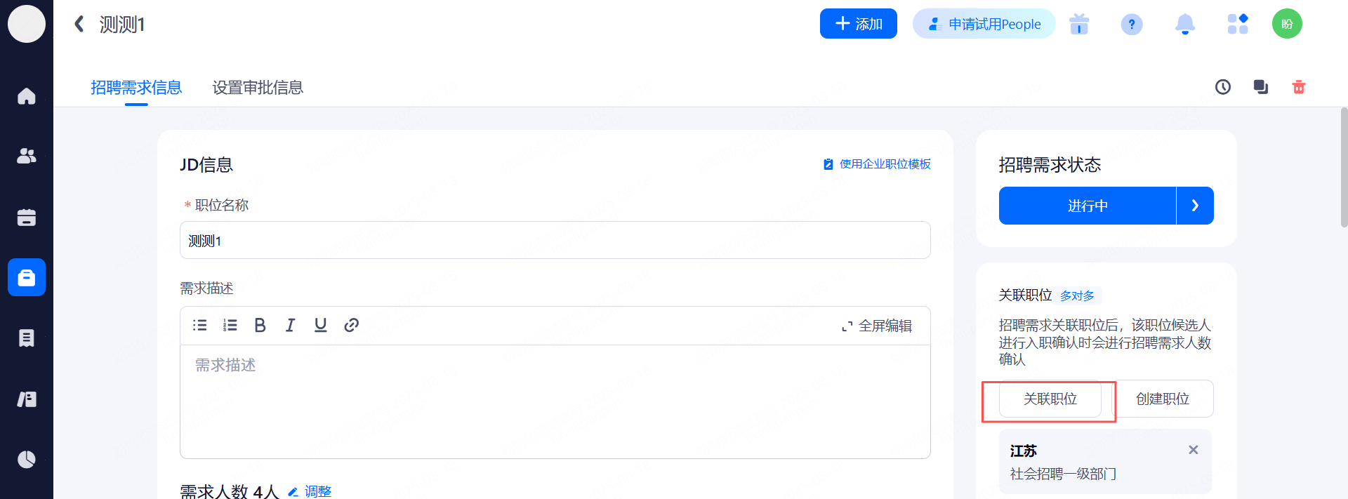 点击进入具体的招聘需求,可以右侧栏添加关联职位或根据该招聘需求创建新职位。
