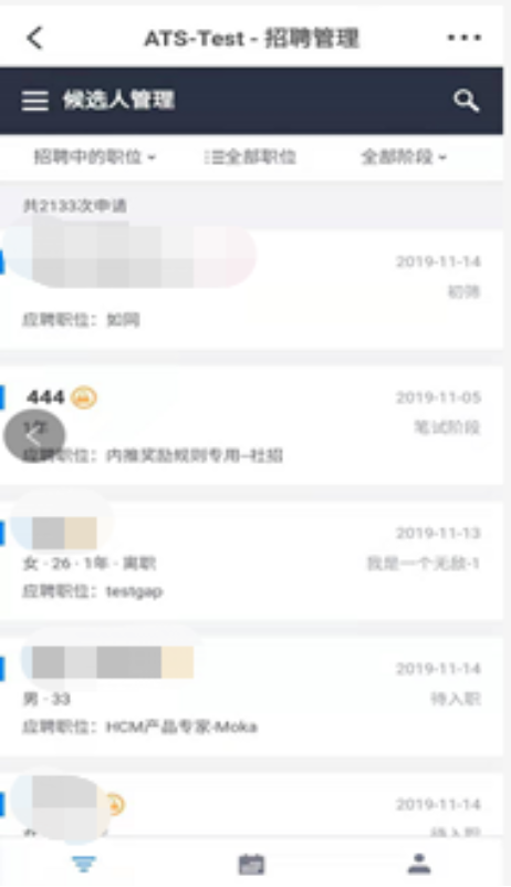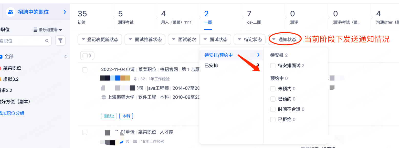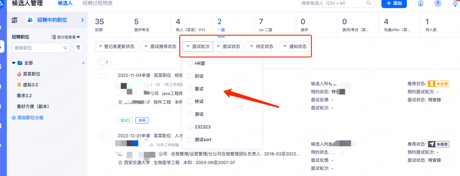 • 当候选人管理在面试型阶段时,系统支持更细化的筛选项,包括面试轮次、面试状态、待定状态,HR可以根据轮次、状态等信息更精准的筛选候选人。