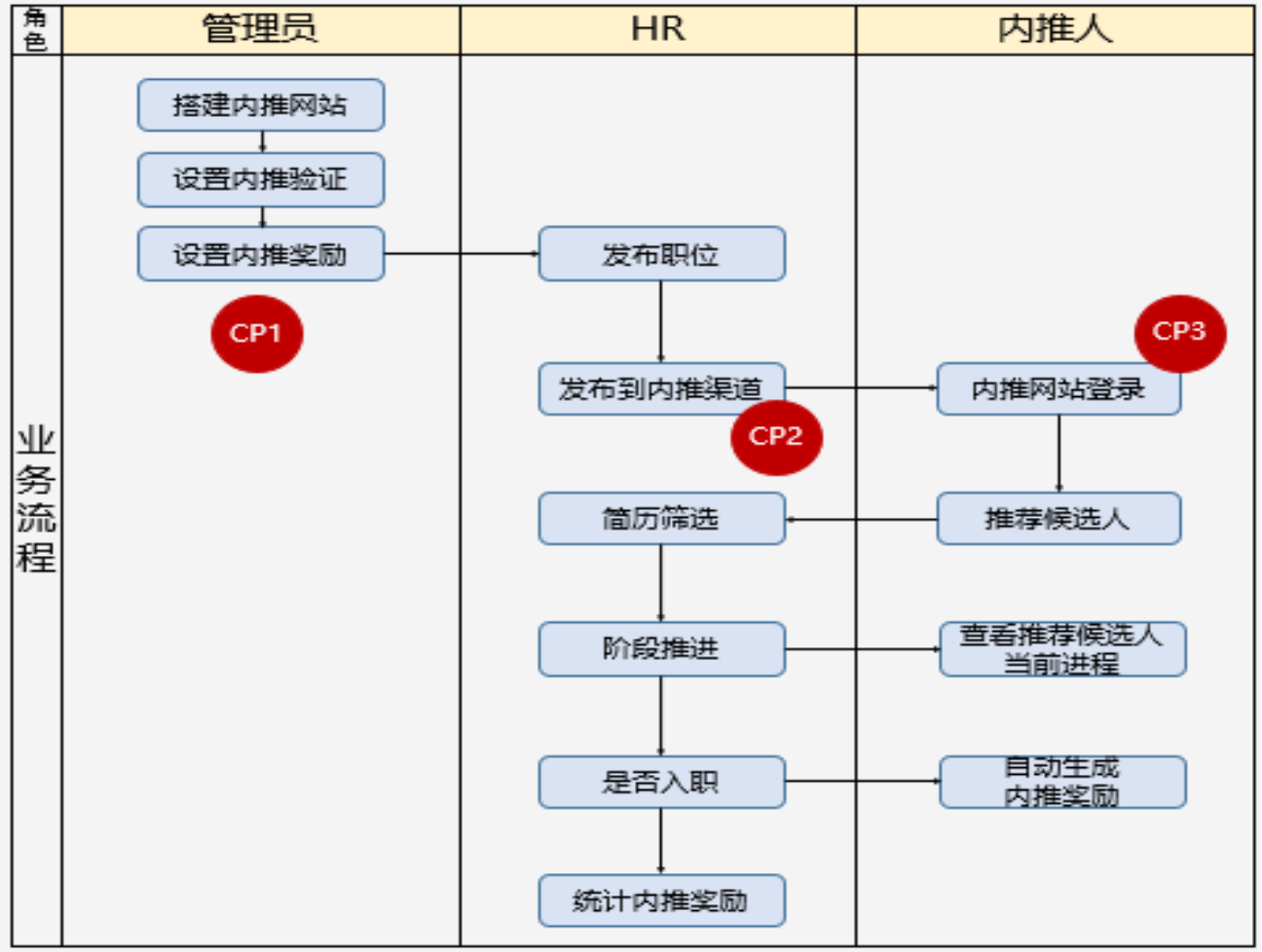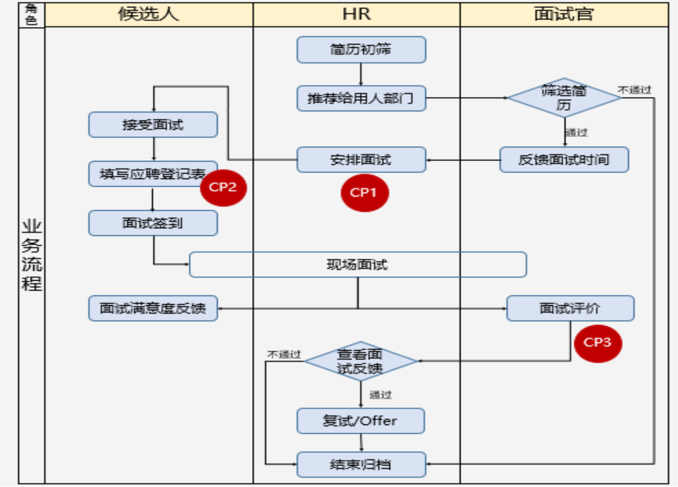 CP1:安排面试时需要注意面试轮次、通过系统发通知给候选人和面试官。
