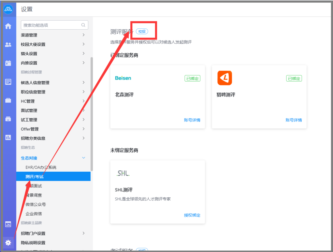 • 校招/社招的测评帐号可拆分:考试测评帐号区分校招和社招,且支持绑定多个,如后续测评只需在校招使用,只绑定到校招模块即可。