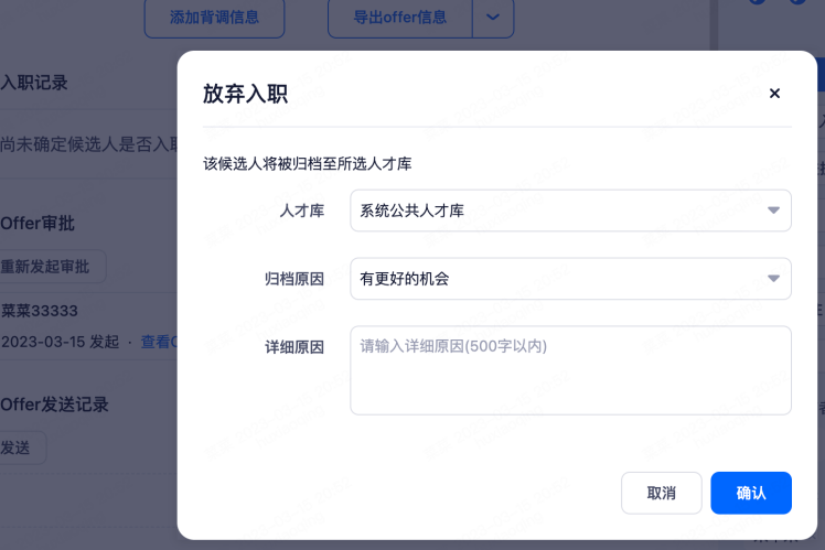 放弃入职的候选人:可以选择对应的人才库进行储备,并打上归档标签。