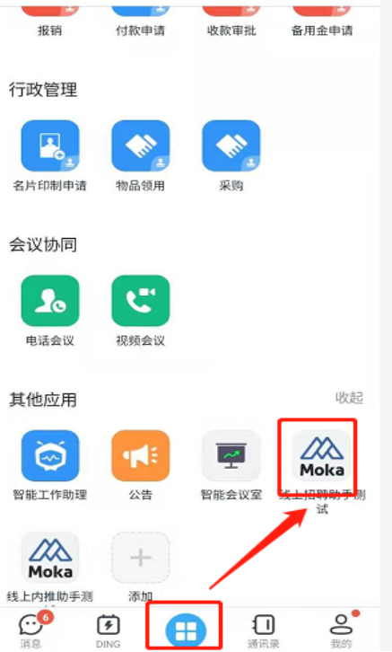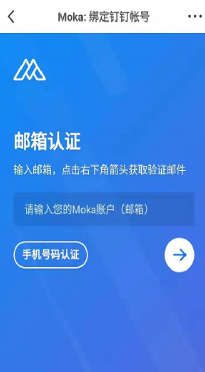 打开钉钉APP在工作台找到“Moka招聘助手”点击图标可进入绑定帐号环节,可通过邮箱帐号和手机号两种方式进行绑定。
