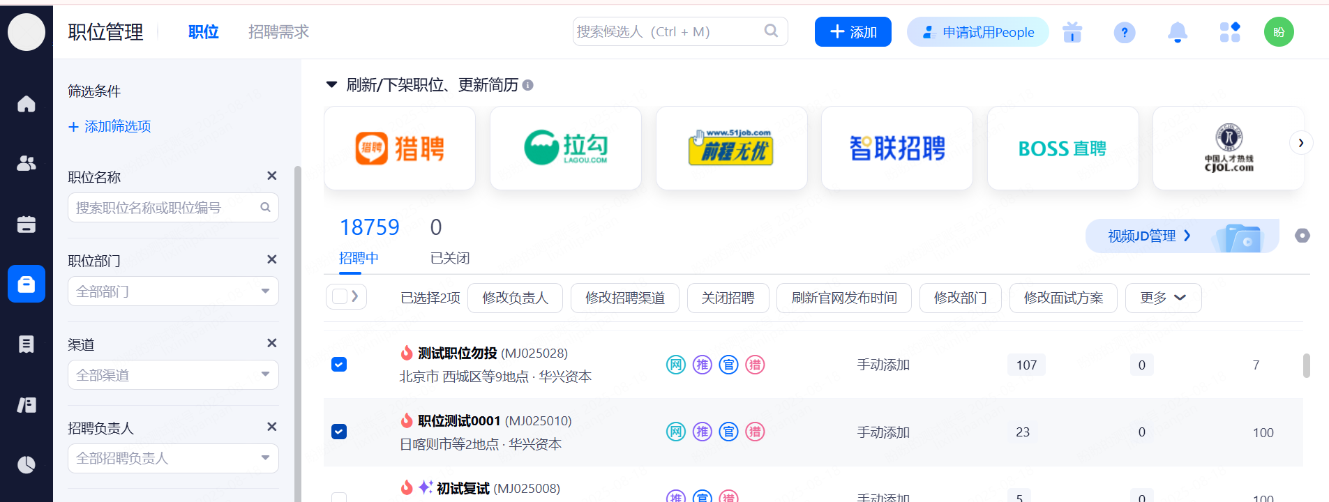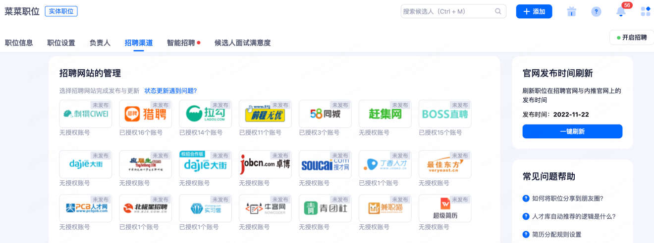 ①一键发布到招聘网站:选择对应的渠道网站,通过插件跳转发布,发布成功以后,该渠道会打上已发布的标签。