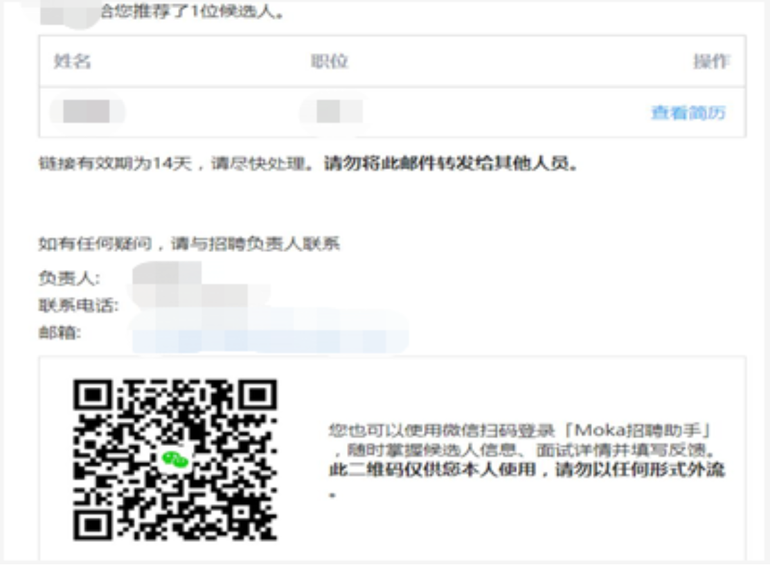 ⑤招聘联络人:候选人投递成功后,展示职位联络人的二维码。