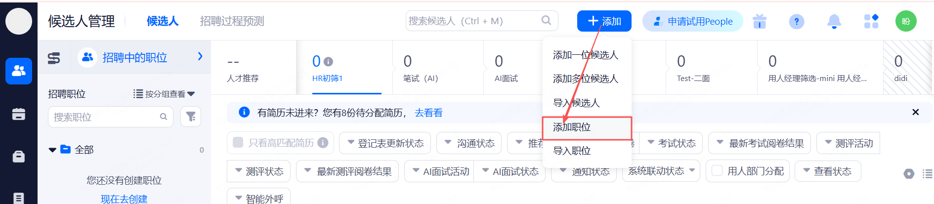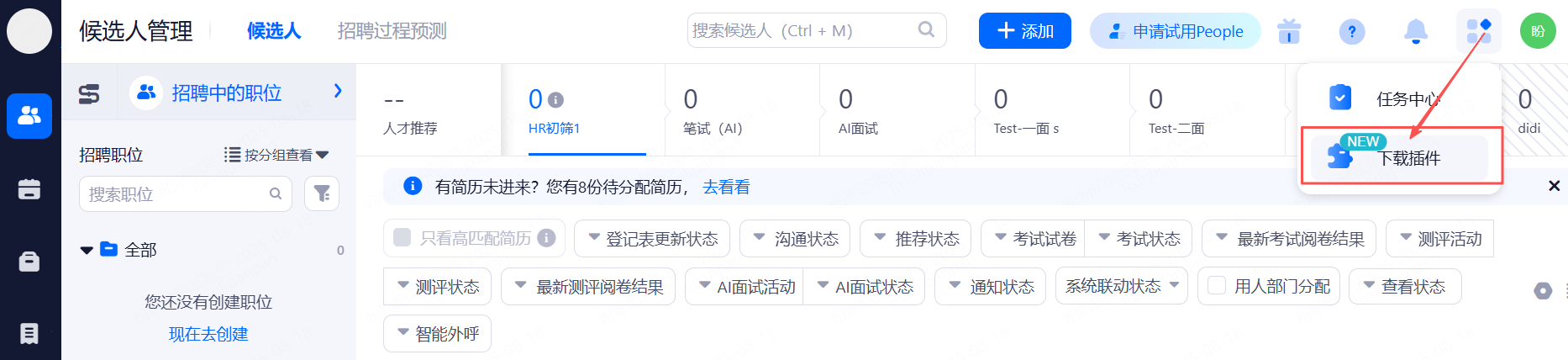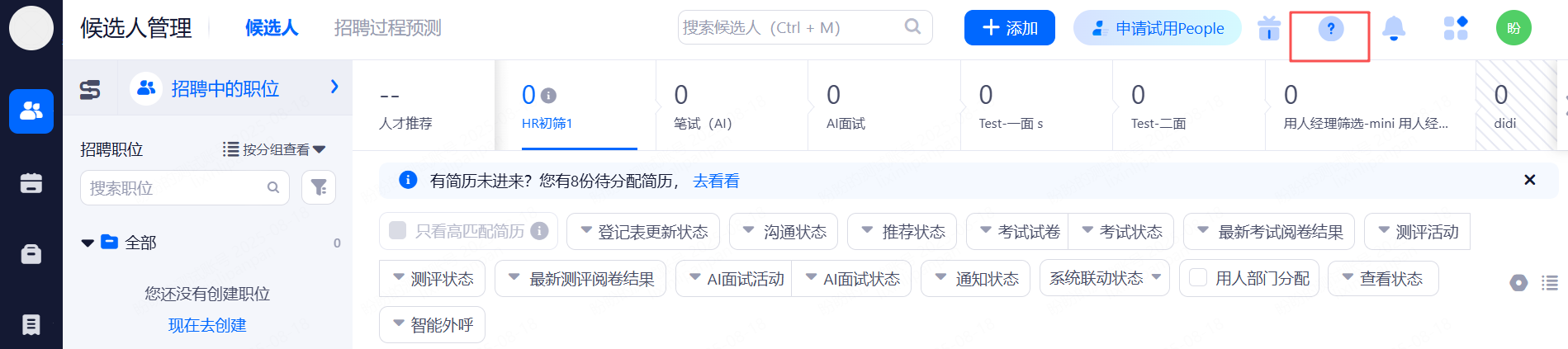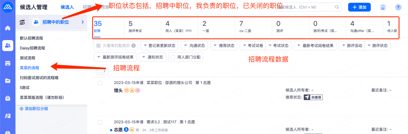 • 点击左侧菜单栏“候选人管理”,默认进入此界面。您可在左上角设置招聘流程和职位状态进行筛选;