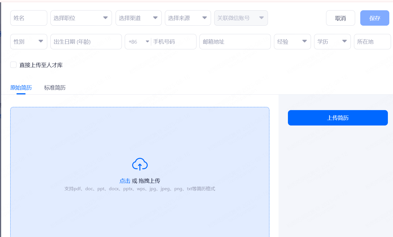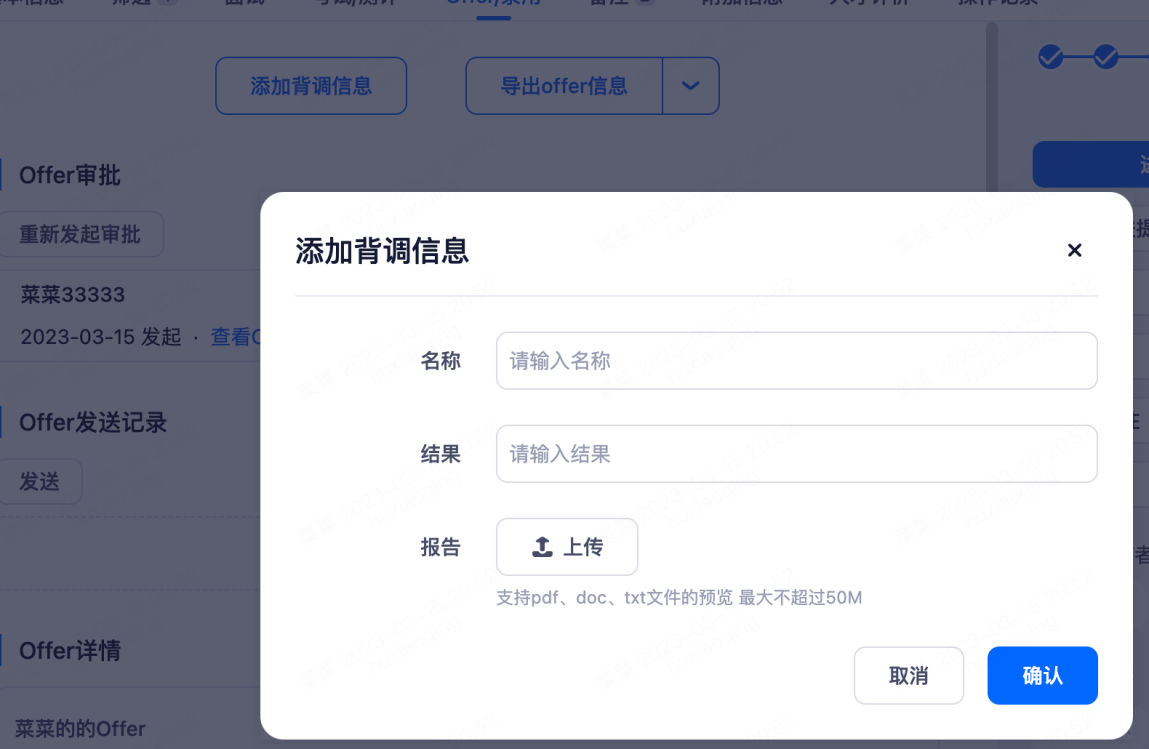 添加背调信息:可直接上传背调模版,支持pdf、doc、txt格式,大小不超过50M。