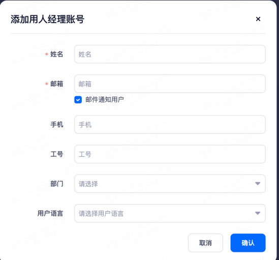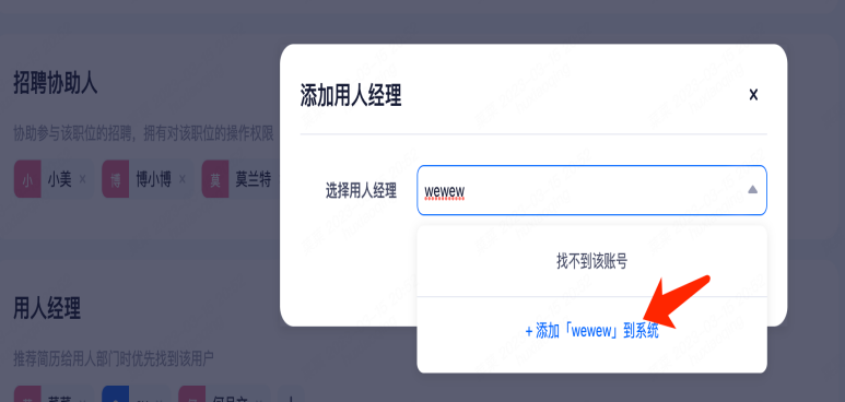 招聘负责人只能有一个,其他角色可设置多个。添加支持快速创建(该功能由企业设置),如需要添加的帐号不在系统列表内,可输入邮箱帐号后点击快速加入,帐号会收到相关邮件,按邮件提示操作即可。