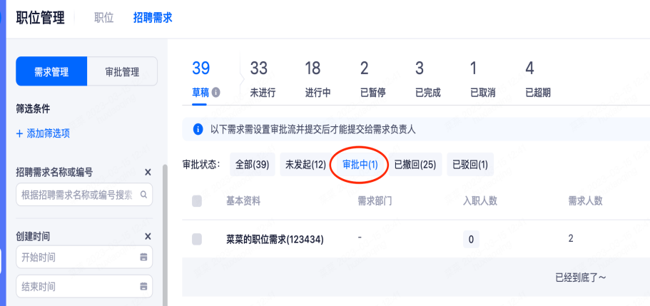 添加需求后台可以进行设置是否需要审批(超级管理员设置),如下图是有审批的截图
