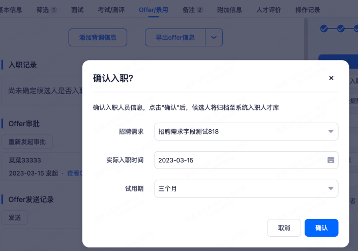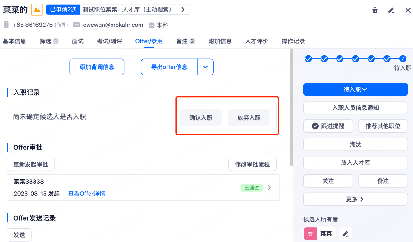 根据候选人的实际情况,选择确认入职或放弃入职。