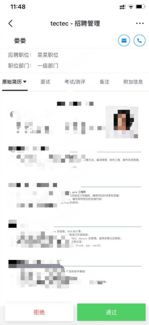 进入系统的简历统一会展示在初筛环节。初筛阶段可由HR筛选,或将合适的简历推荐给用人部门筛选,用人部门操作同意或者拒绝,同意进入下个阶段,拒绝归档(可设置自动移动下个阶段或者直接归档)