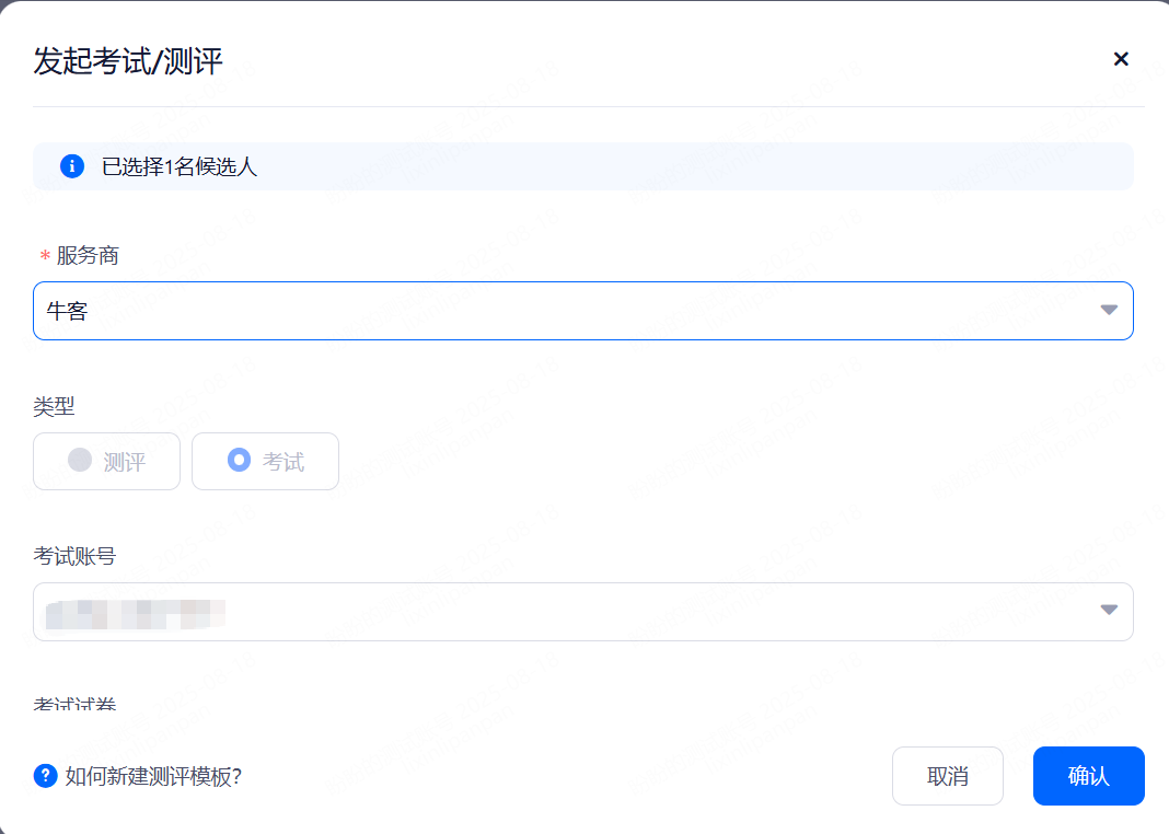 • 若设置了测评阶段,选择相关的测评供应商,选择测评通知模板(测评账号需要提前在系统内绑定)