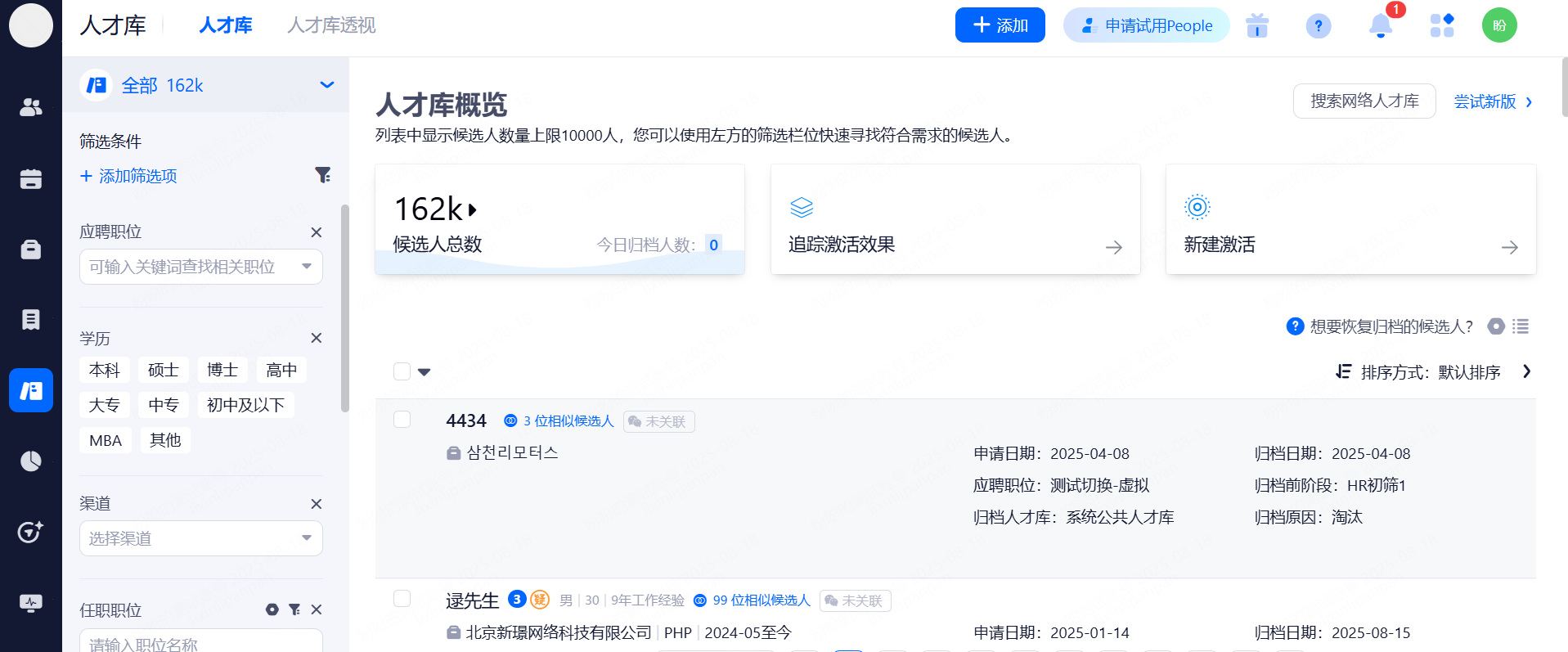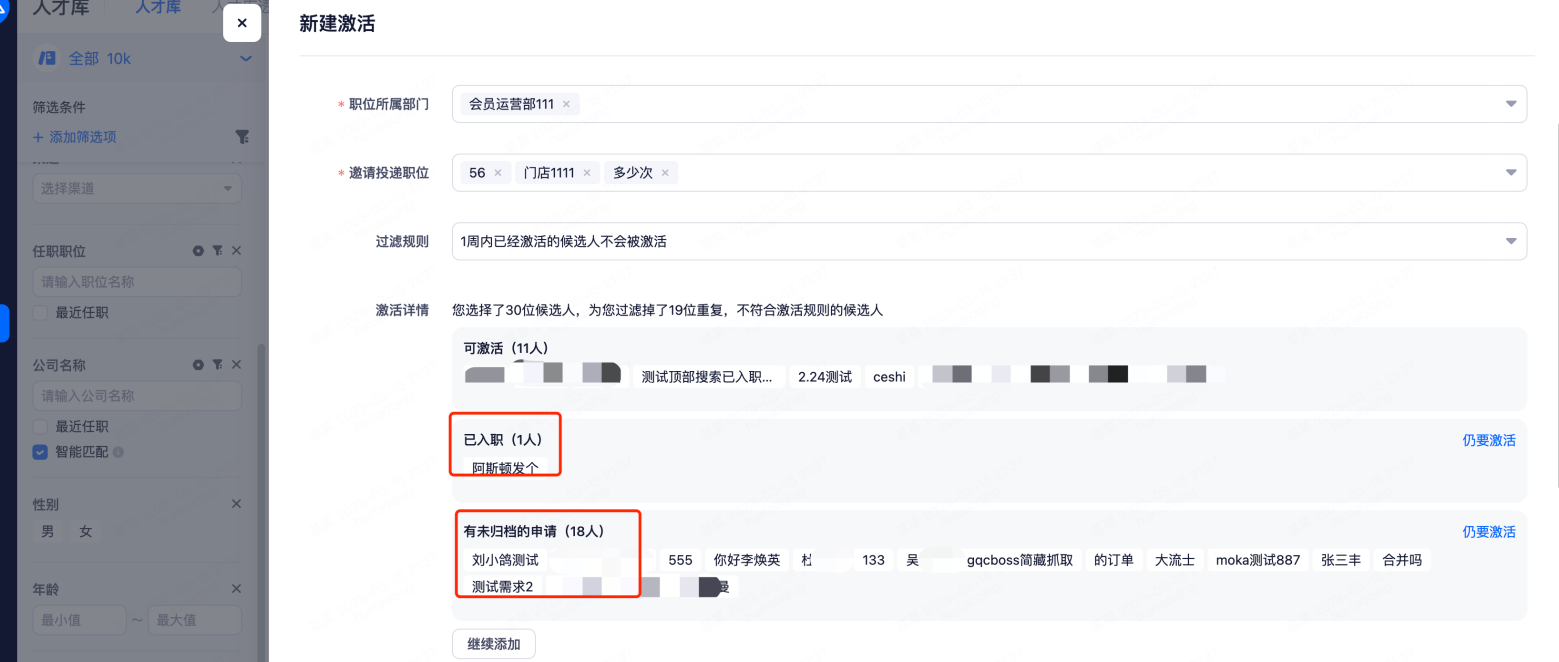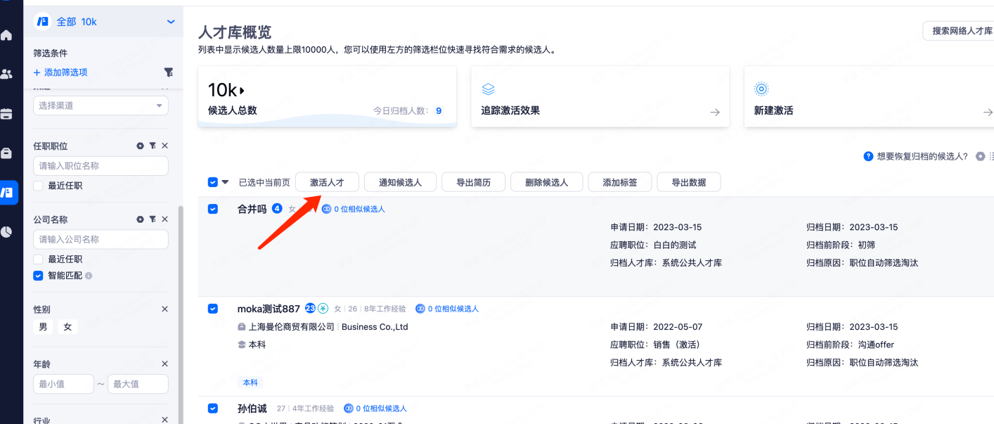 在系统人才库界面,配置筛选条件,筛选您想要激活的候选人,根据选择的数据,进行再次确认