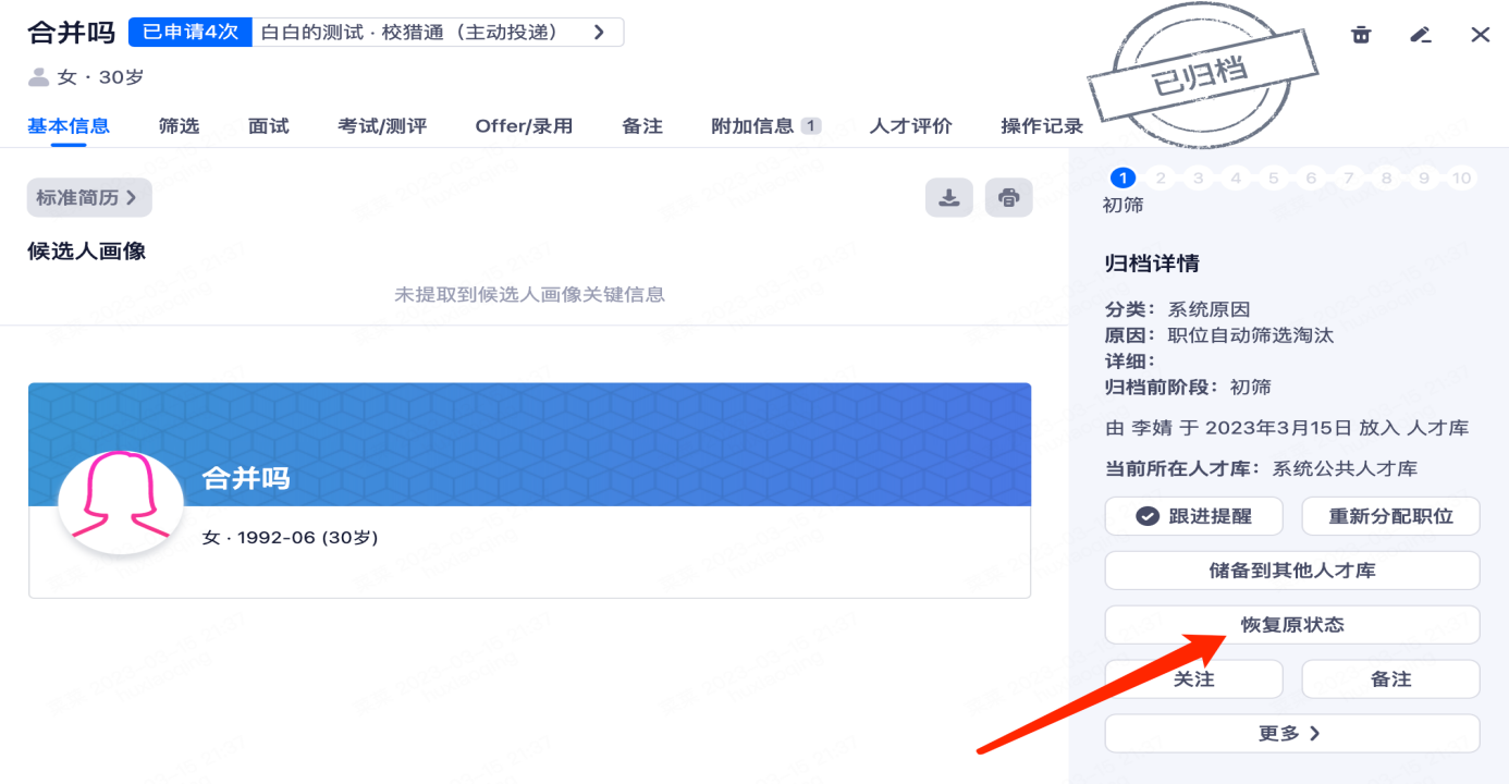 恢复原状态:候选人直接恢复到候选人管理流程中当时操作的阶段,如候选人在面试后阶段归档,恢复后直接显示在面试阶段。