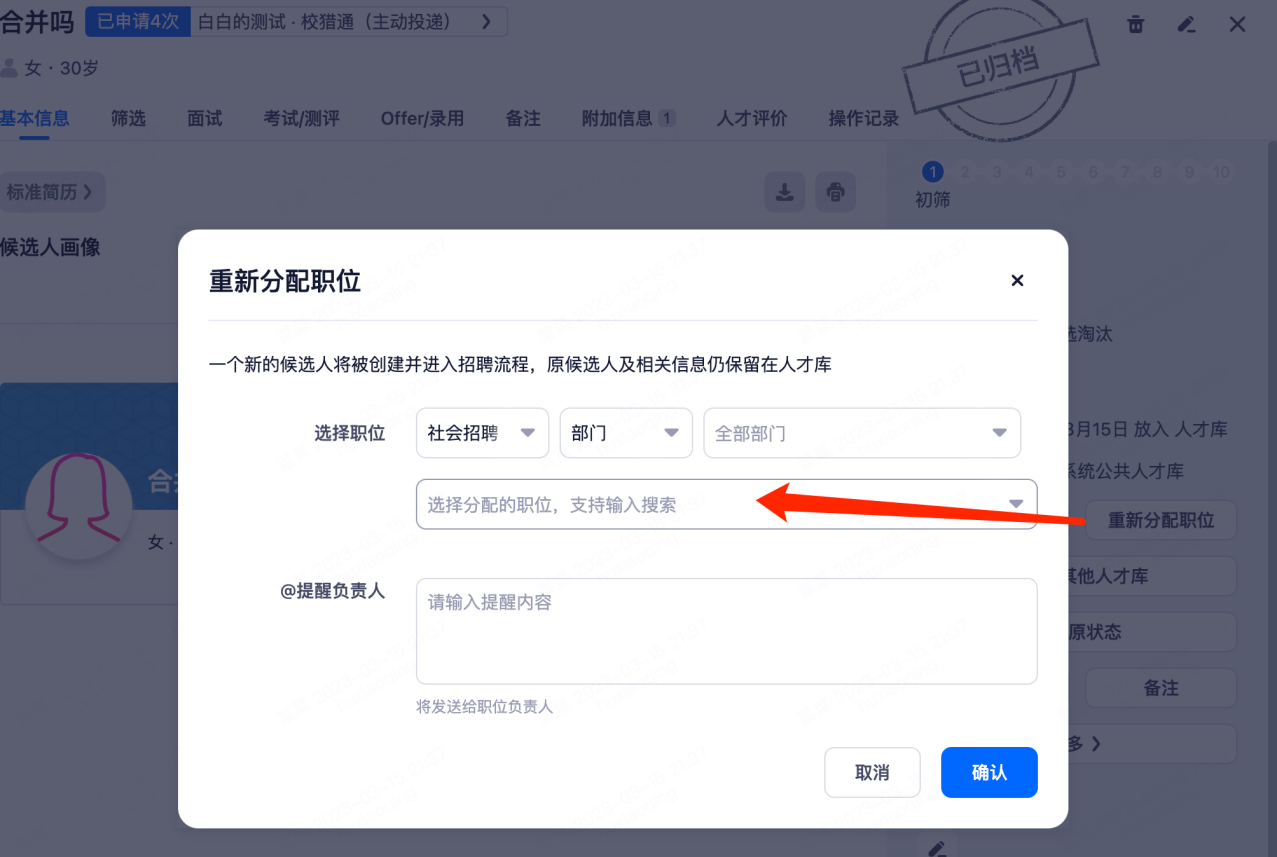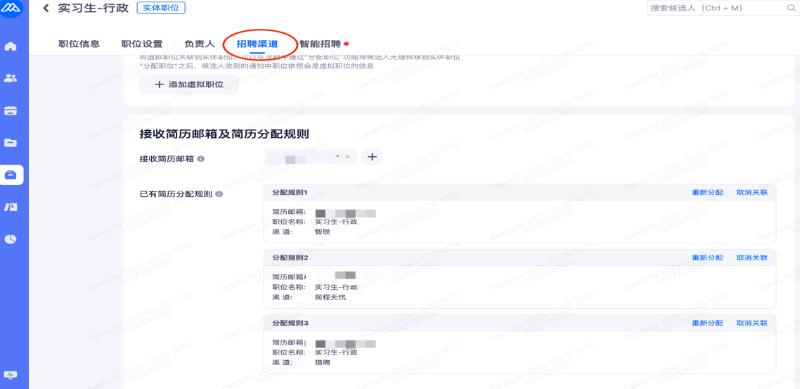 重新分配职位:候选人进入到分配的职位初筛阶段(招聘流程中第一个阶段),渠道会显示为人才库