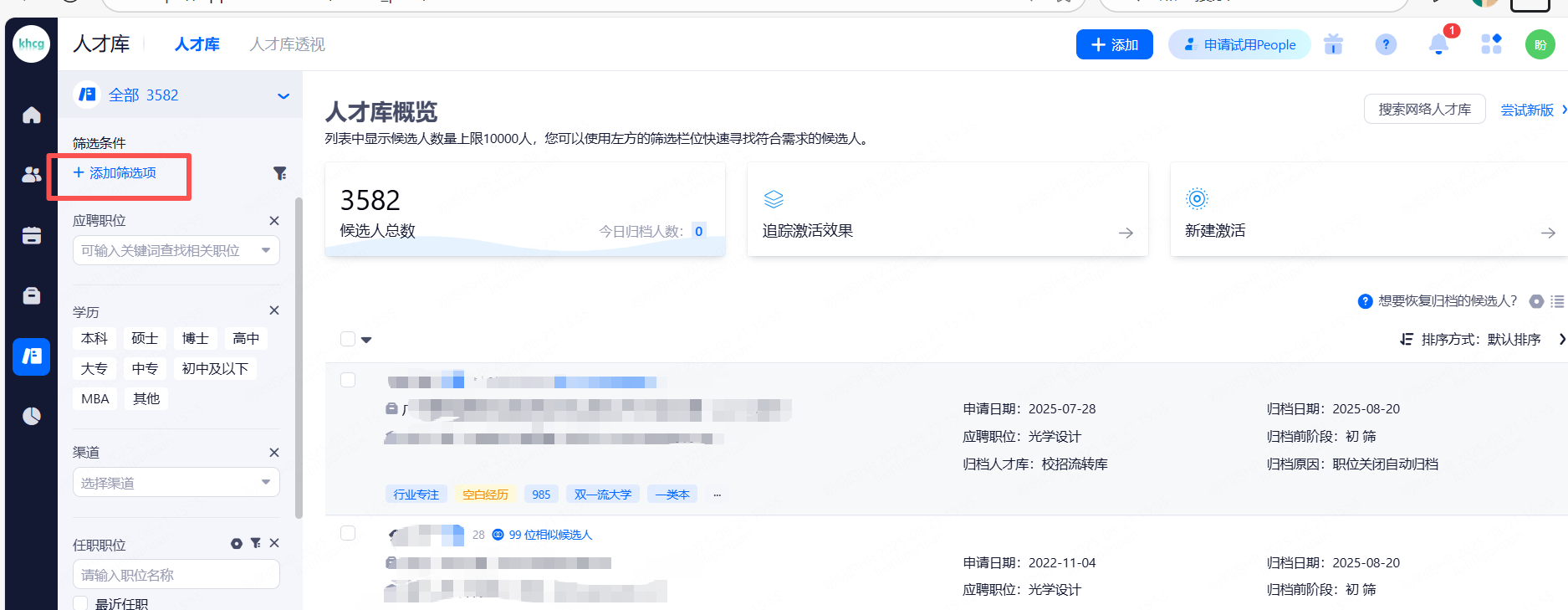 在人才库界面左侧筛选栏进行条件筛选,可自定义添加筛选项。可筛选字段包括但不限于:职位负责人、候选人状态、职位类别、职位性质、籍贯等。