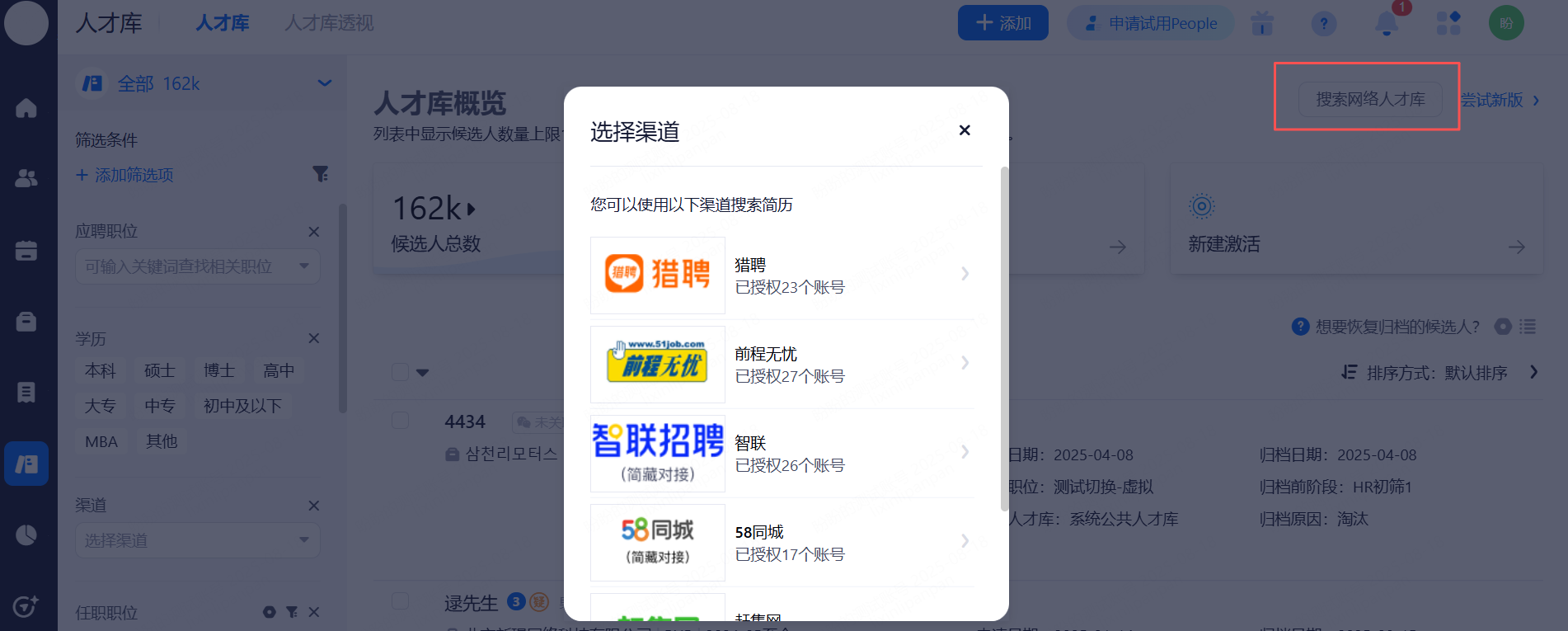 主动搜索:右上角的搜索网络人才库为主动搜索渠道简历的功能,通过插件跳转到对应渠道搜索简历,会自动判断该简历是否已存在于系统当中(避免重复下载)。