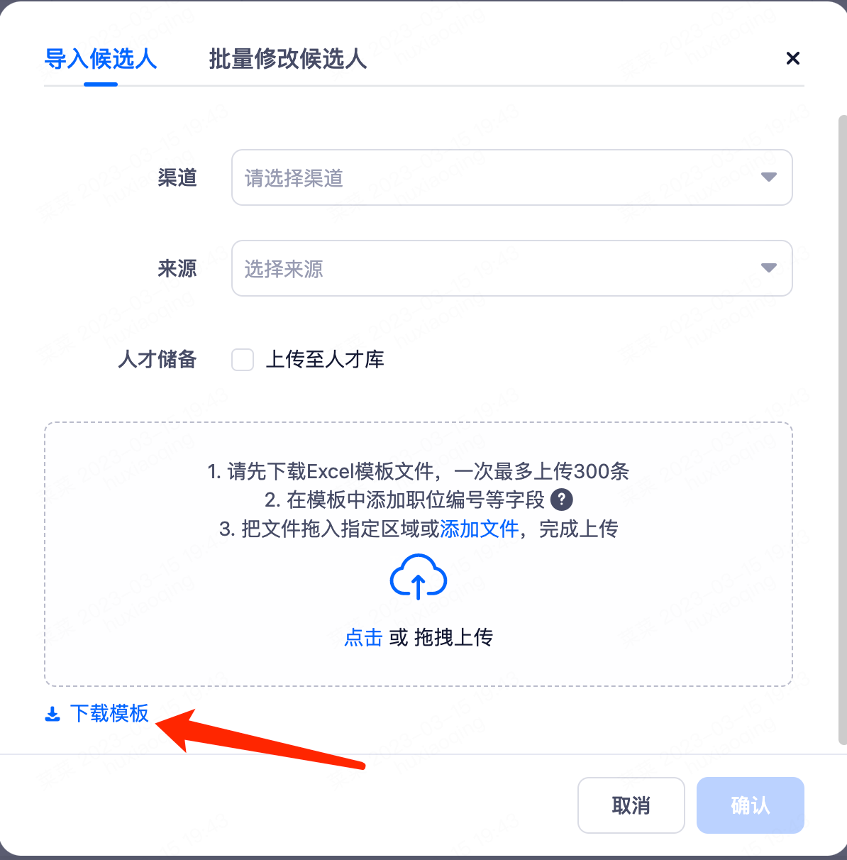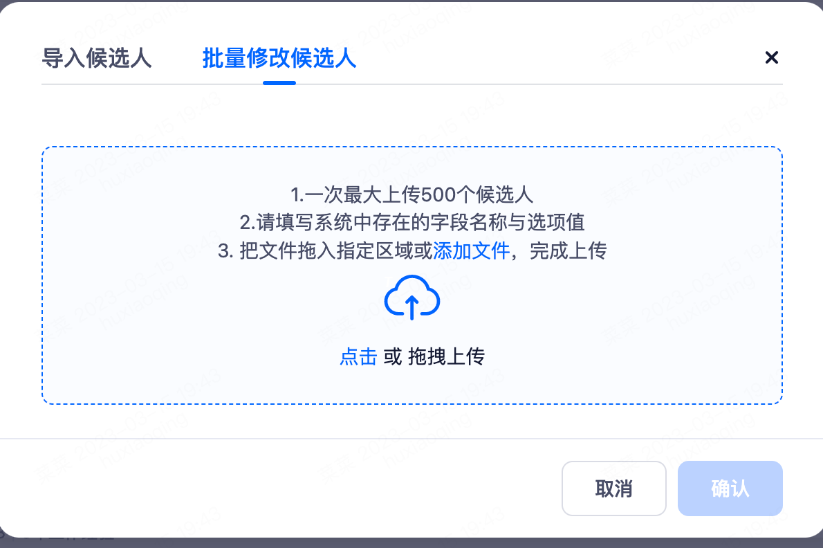 您也可以选择导入候选人,需要先下载Excel模板,添加好候选人之后再上传文件批量导入系统,根据表头添加候选人信息,表格内不支持手动添加字段,如有其他字段可以联系超级管理员进行设置。