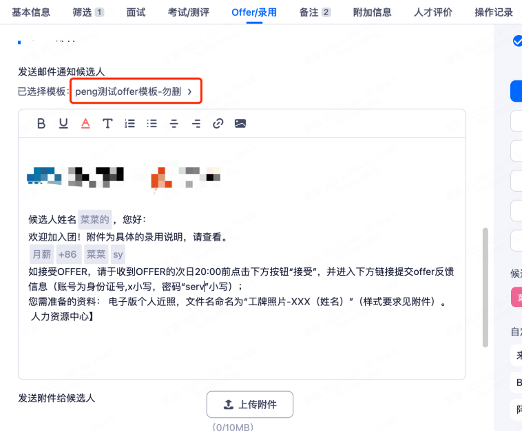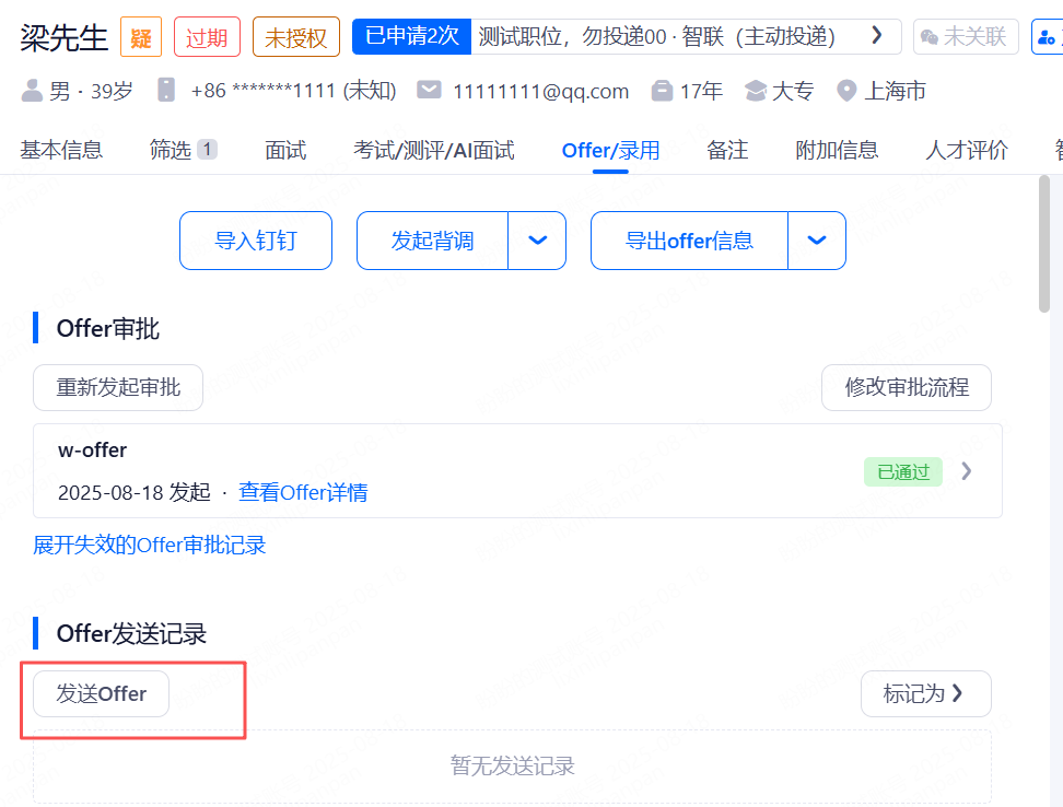 Offer发送:Offer审批通过后,发送按钮将解锁,可点击发送Offer给候选人。HR给候选人发送Offer之后可以查看自己发送的Offer内容详情、邮件内容、短信内容,以及具体的发送时间。