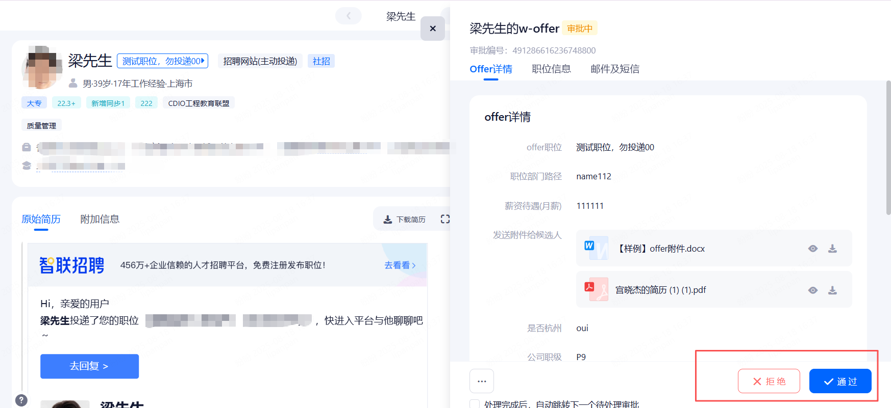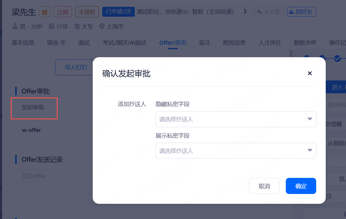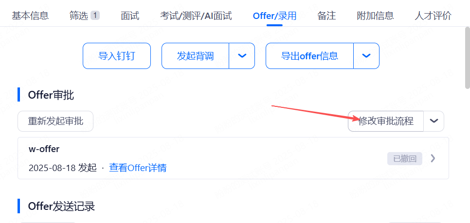 • Offer审批:根据职位绑定的审批流程,发起审批,可以临时修改审批流程。