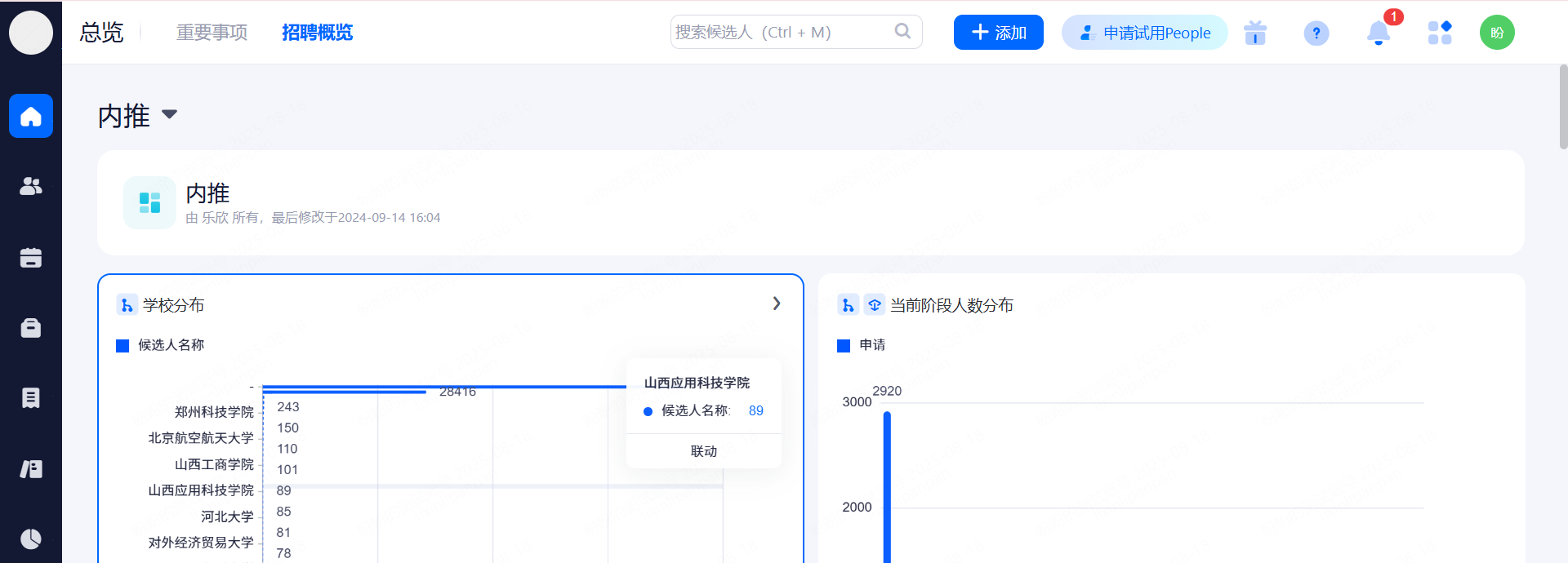 招聘概览以数据和模块的方式呈现,有不同的概览图,可以清晰看到系统中目前的数据分布情况