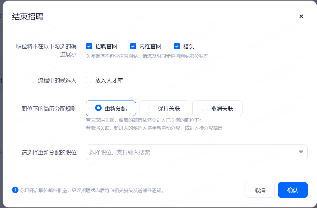 ③如果职位关联了简历分配规则,可以选择重新分配、保持关联、取消关联,设置之后可点击确认结束该职位的招聘。