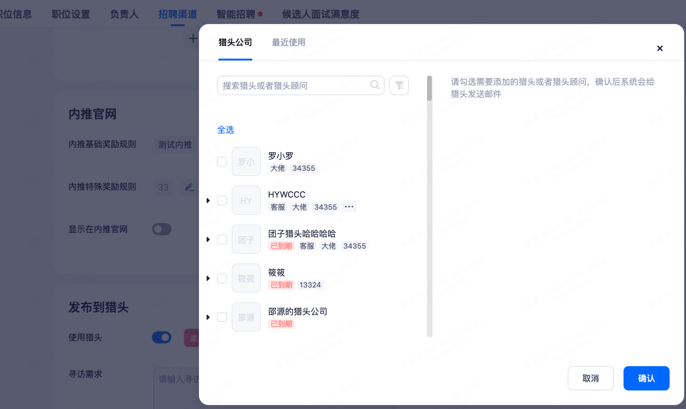 ④使用猎头:勾选后可以选择指定猎头,将职位开放给该猎头。