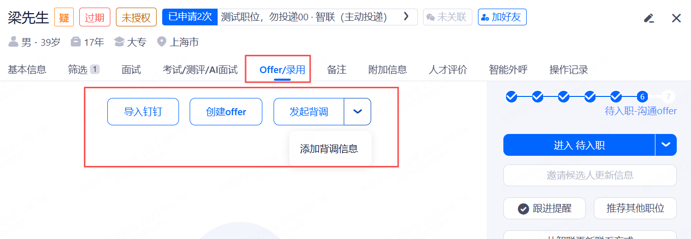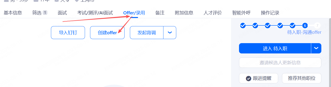 在沟通offer环节可以添加背调信息,创建offer,offer审批并把offer发送给候选人。导入EHR需要接口实现。