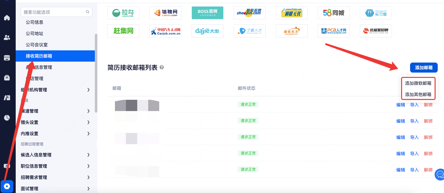 在设置-公司信息管理-接收简历邮箱里,可添加邮箱,点击“高级模式”绑定邮箱。