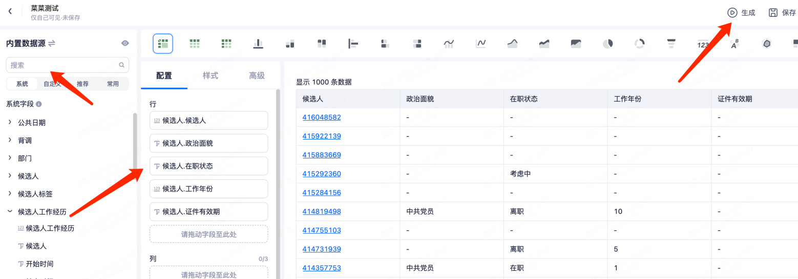 左侧系统字段,将需要的字段直接拖拽或者双击,放置在“行”和“列”,点击生成,确认是否需要的数据,最后点击保存即可。