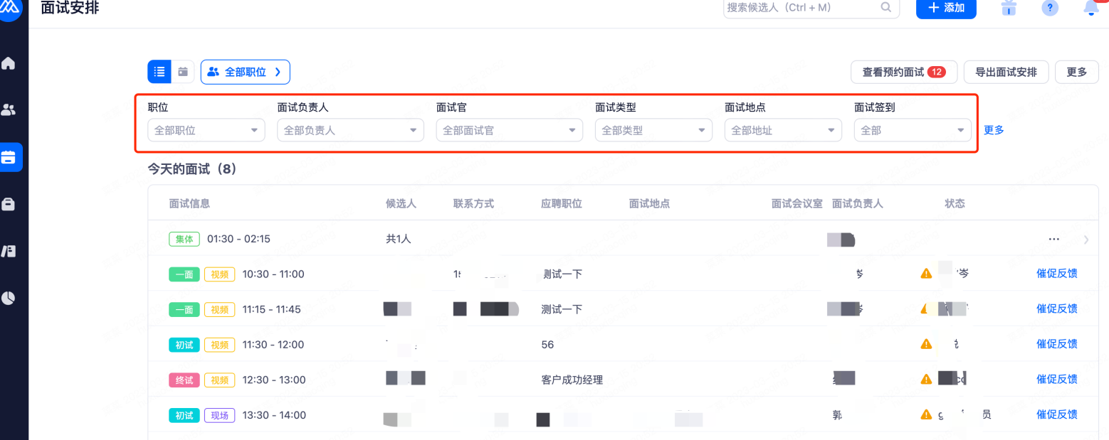 在左侧菜单中找到面试安排,点击跳转面试安排详情页面,可以以列表的形式查看今天的面试、过往的面试以及今后的面试安排,并对未反馈的面试进行催办。