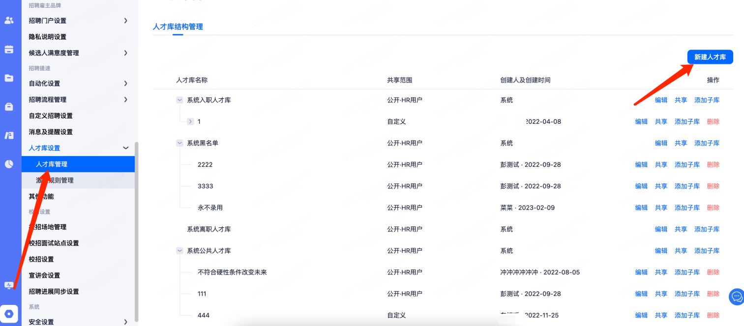 系统设置里点击“人才库管理”可以新建和修改人才库,且可以创建子人才库;有权限的HR可以针对离职人才库、黑名单、自定义人才库增加子库,方便HR对不同人才库候选人进行分类管理。