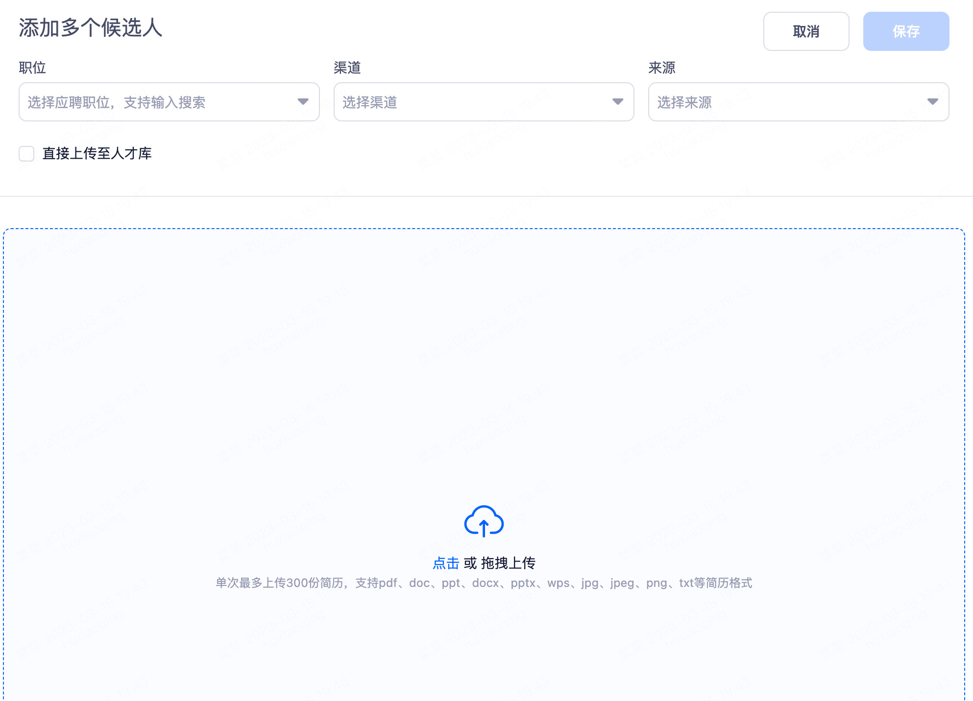如选择添加多位候选人,也可以直接把简历拖拉至空白区域,需要注意单次上限300份简历