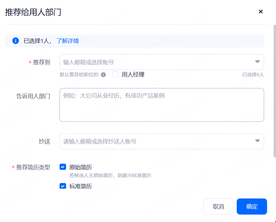 使用简历:可选择让用人经理查看简历的样式,原始简历(简历原件)和标准简历(系统解析简历)。