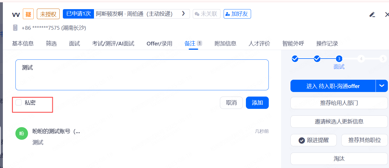 • 备注@功能:可以在备注中@某个拥有系统帐号的人(招聘人员,用人经理,面试官,猎头等),进行公开/私密的沟通。