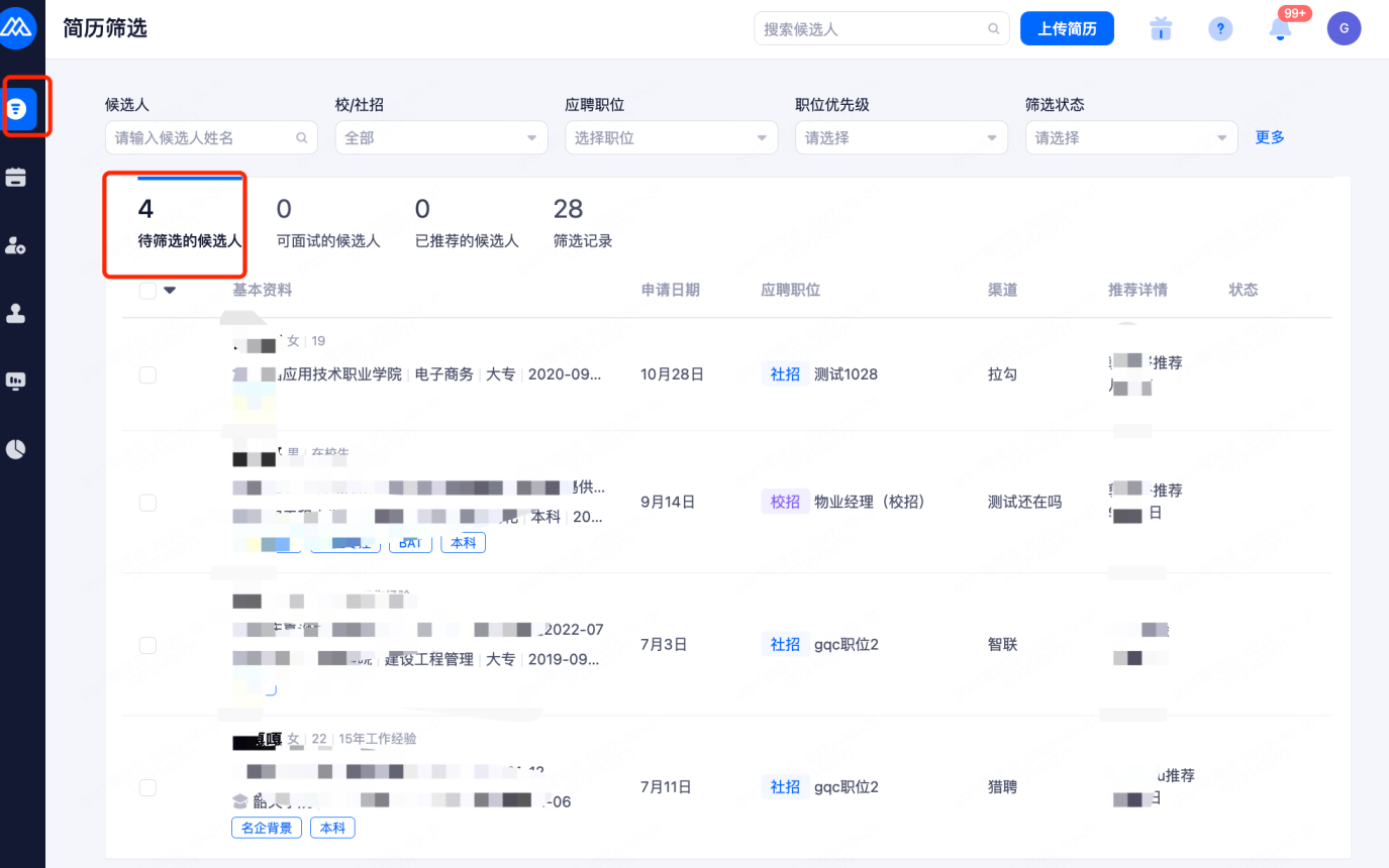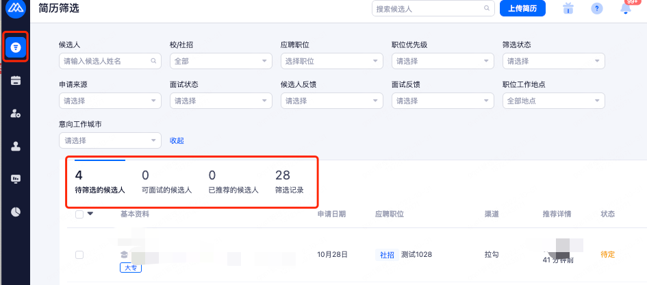您可以在这里查看HR推荐的待筛选的候选人和已筛选记录;若您需要进行特定的查找,您可以根据简历字段或候选人所处阶段快速筛选和查看候选人。