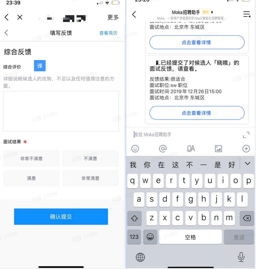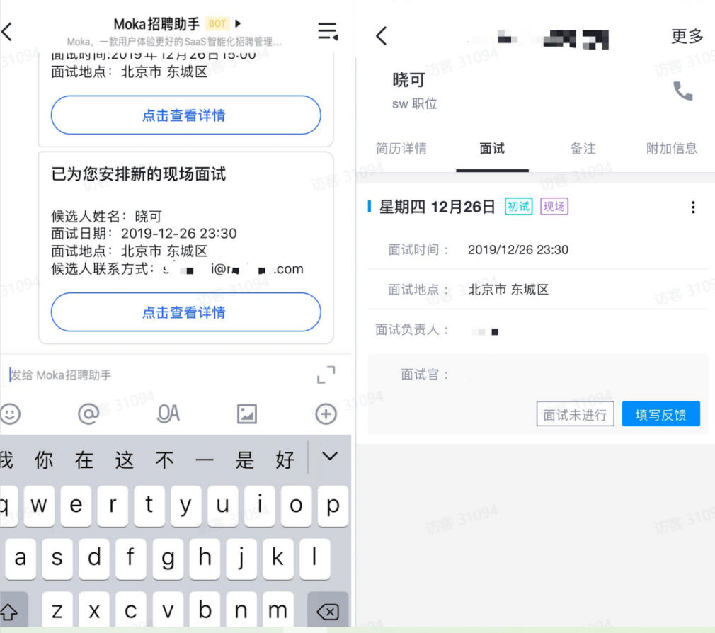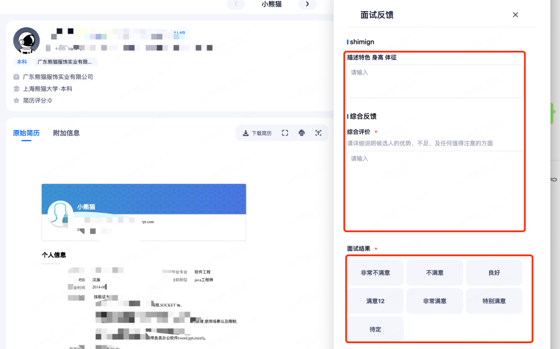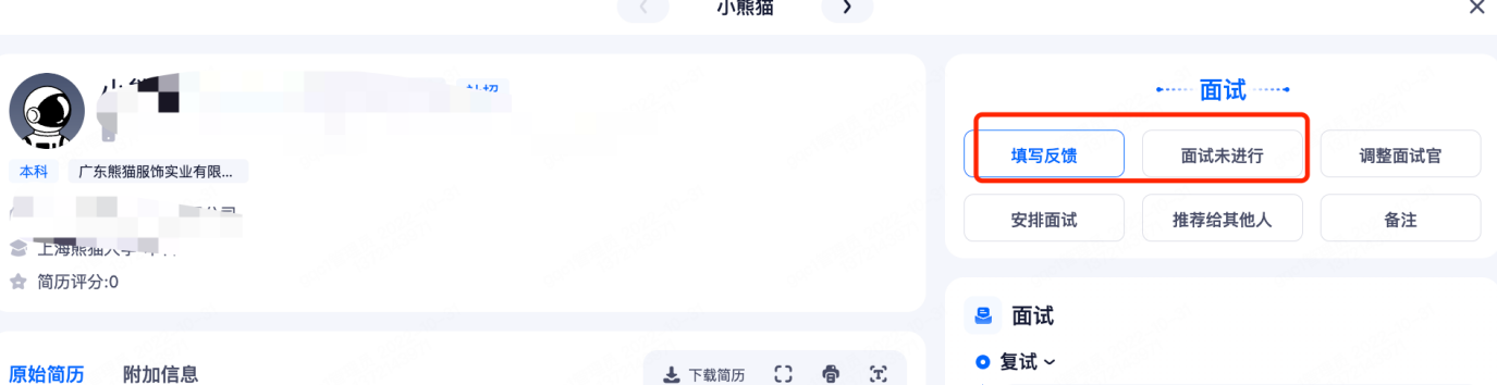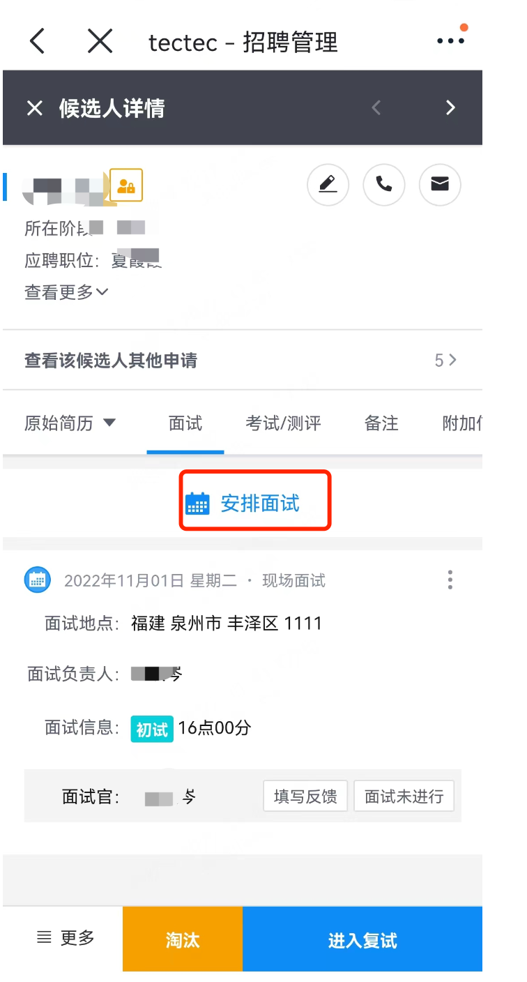 您可通过PC端或移动端系统进入候选人的面试详情,在面试未如约进行或顺利结束后进行反馈。
