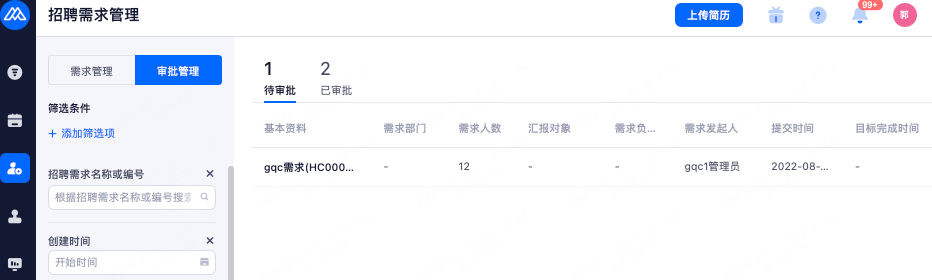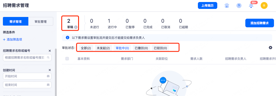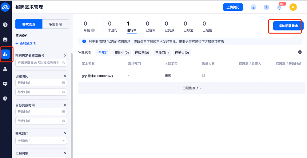 您可以在这里添加招聘需求,并且查看自己提交的需求各个状态的显示情况
