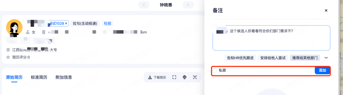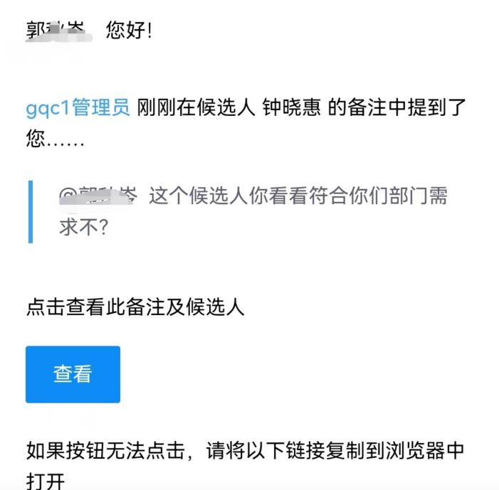 若简历筛选之后暂时不符合本岗位的要求,但想推荐给其他用人经理/面试官,可在备注@其他用人经理/面试官,则对方会邮箱和系统中收到简历信息。