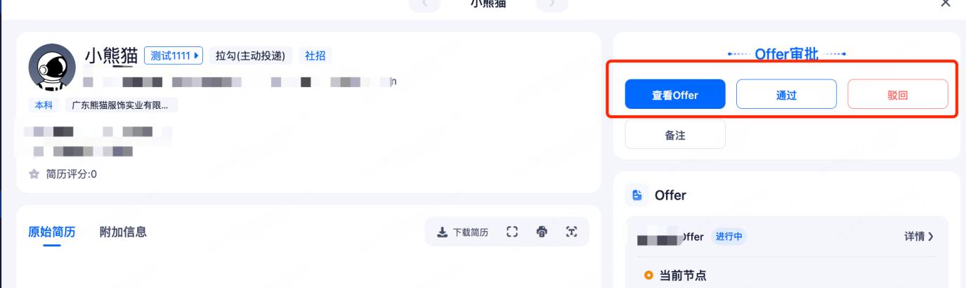 在Offer审批页面点击候选人,您可查看待审批的Offer详情。在系统PC端,您可在右侧栏选择通过/驳回Offer,并填写审批意见;也可以查看职位详情及备注信息。