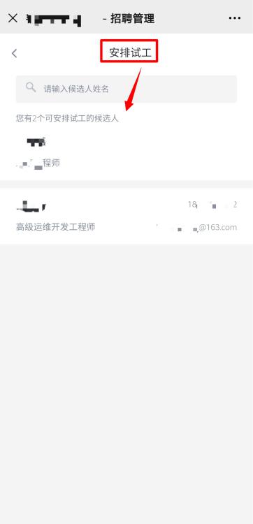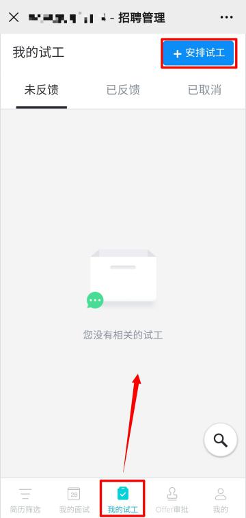 若您业务上有试工的需要,点击移动端底部我的试工,您可以查看处于试工阶段的候选人情况;右上角您也可以为候选人安排试工。