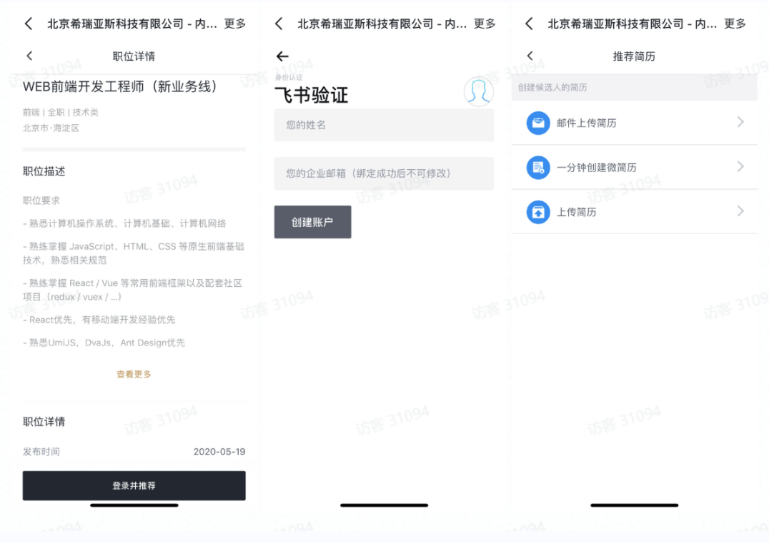 · 推荐候选人:从内推官网点击职位详情页面,即可推荐简历。若您未绑定内推账户,需进行验证。