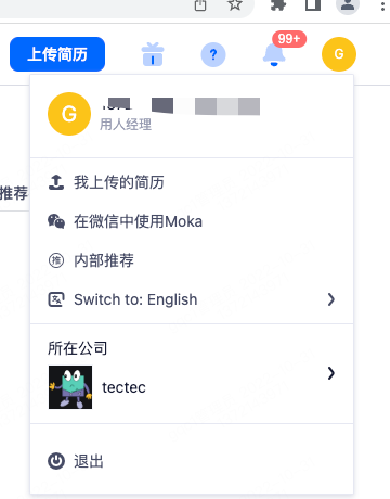 将鼠标移至账号图标,您可以在这里查看您已上传的简历、通过微信登录Moka、使用内推、切换语言等。