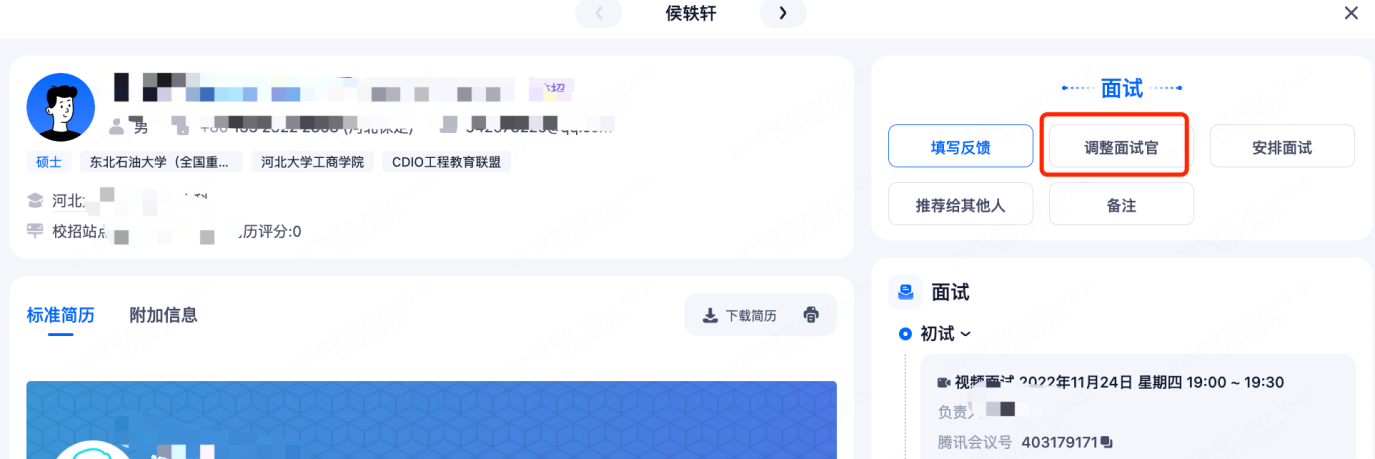 若您临时无法参加面试,需要调整面试官,您可以进入简历详情,点击PC端的右侧栏或移动端右上角三个点,即可修改或增加面试官。