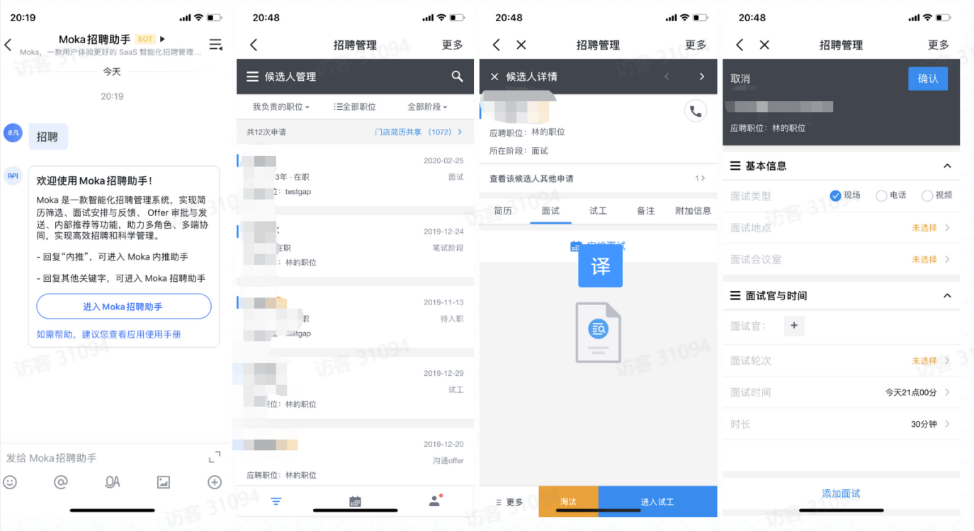 - Moka移动端功能与PC端主要功能相同,包括简历筛选、面试安排、Offer审批、搜索候选人、内推入口和在线客服;若您有业务需要,您还能在移动端对候选人安排试工。