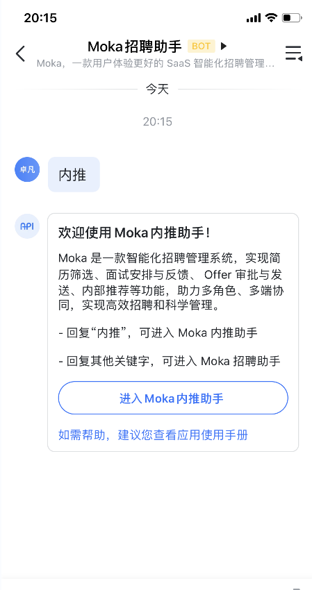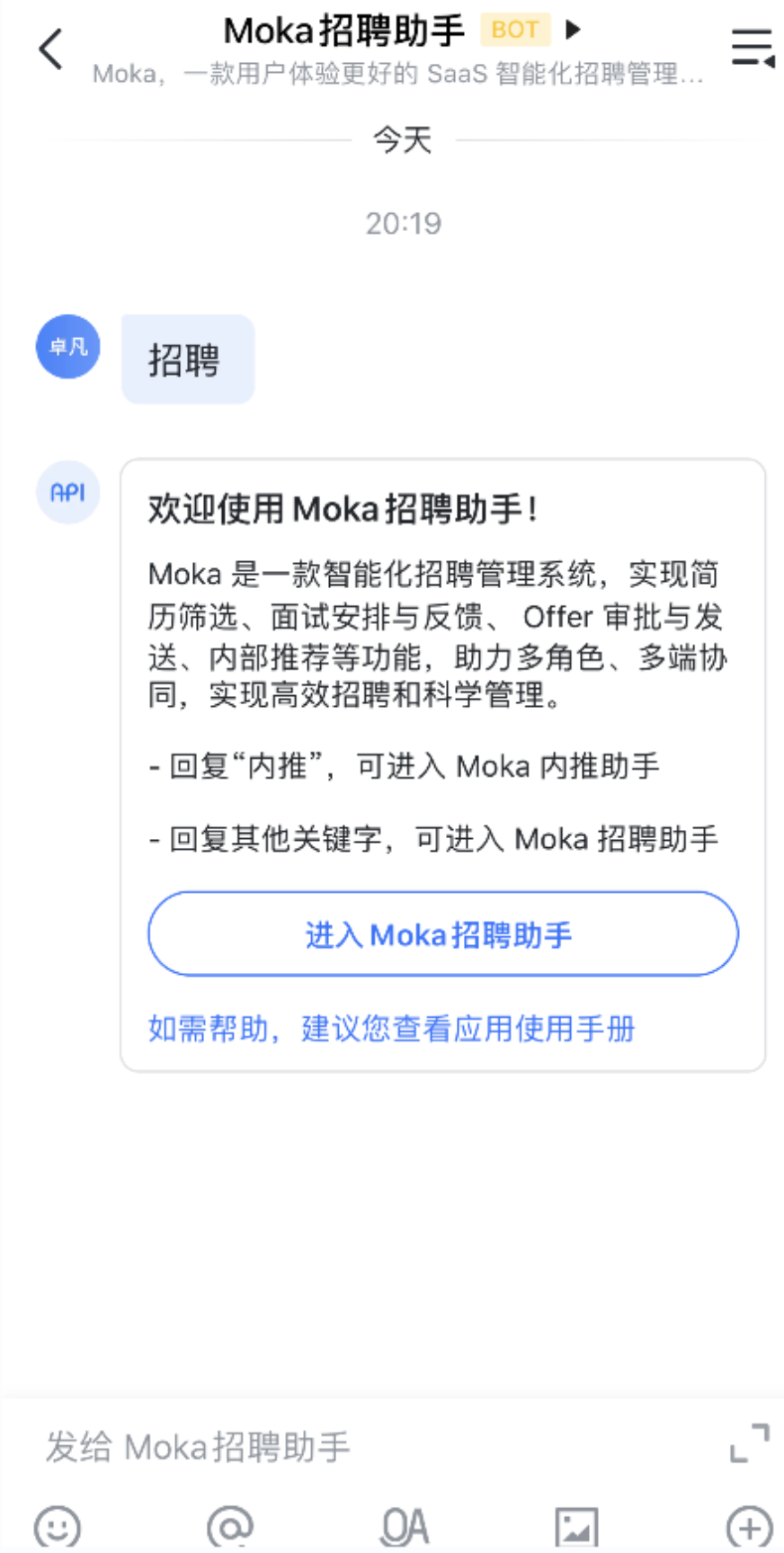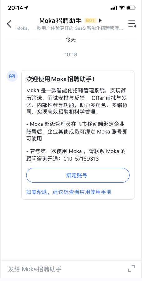 - 首次进入“ Moka 招聘助手”机器人,将收到欢迎消息。点击“绑定账号”,即可跳转至“ Moka 招聘助手”进行账号绑定。