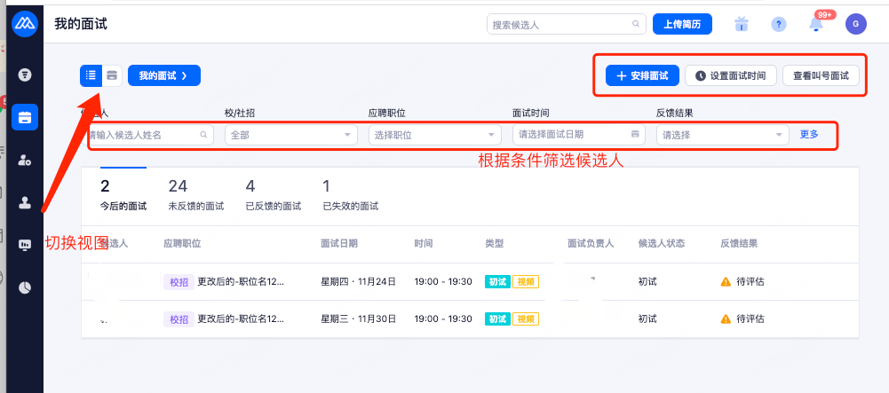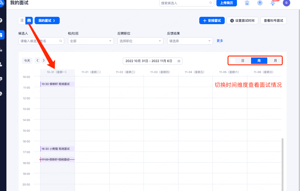 点击我的面试,您可以查看不同面试阶段的候选人,可选择列表或日历形式。