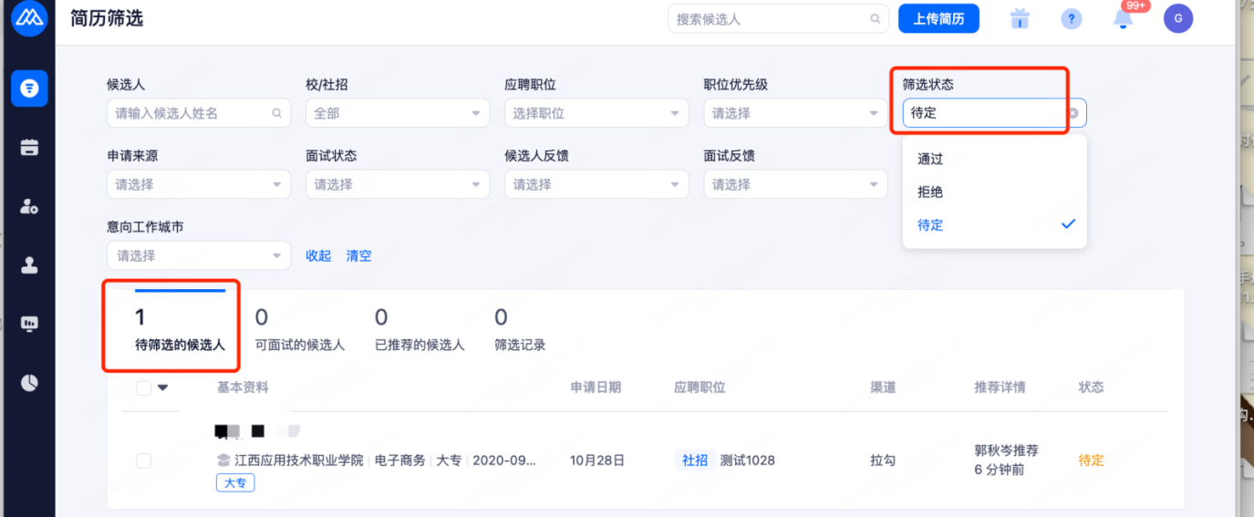 若简历需要观望,您可以选择“待定”保留候选人,后续在简历筛选栏-筛选状态-待定中可以查询待定候选人。