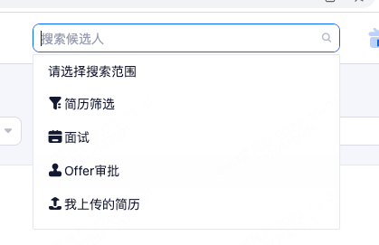 您可以直接在Moka系统页面的右上角搜索框搜索候选人,可以输入内容后选择搜索范围,或选择搜索范围后输入内容。