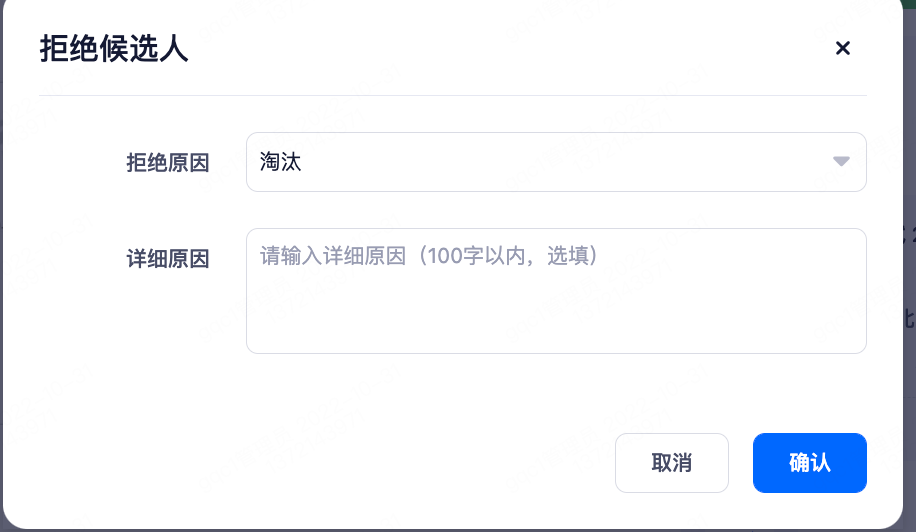 若简历不通过,点击“拒绝”淘汰候选人并归档人才库,您需要选择拒绝原因,便于HR进行淘汰候选人管理。